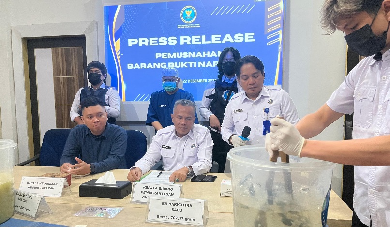 “Pada siang hari ini kita melaksanakan pemusnahan barang bukti dari tersangka yang telah kita lakukan penangkapan. Barang bukti ini sudah melalui pemeriksaan laboratorium dan dinyatakan positif mengandung narkotika,” kata Kepala Bidang Pemberantasan BNNP Kaltara, Kombes Pol. Khoirun Hutapea kepada sejumlah media.