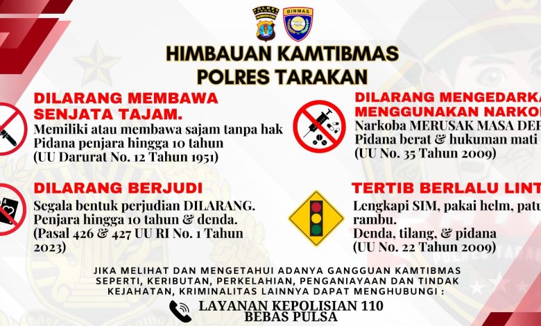 TARAKAN — Upaya menjaga Keamanan dan Ketertiban Masyarakat (Kamtibmas) terus diperkuat Polres Tarakan. Melalui imbauan resmi yang disertai dasar hukum jelas, kepolisian mengajak seluruh masyarakat untuk semakin sadar hukum dan menjauhi berbagai bentuk pelanggaran yang berpotensi mengganggu ketentraman lingkungan.