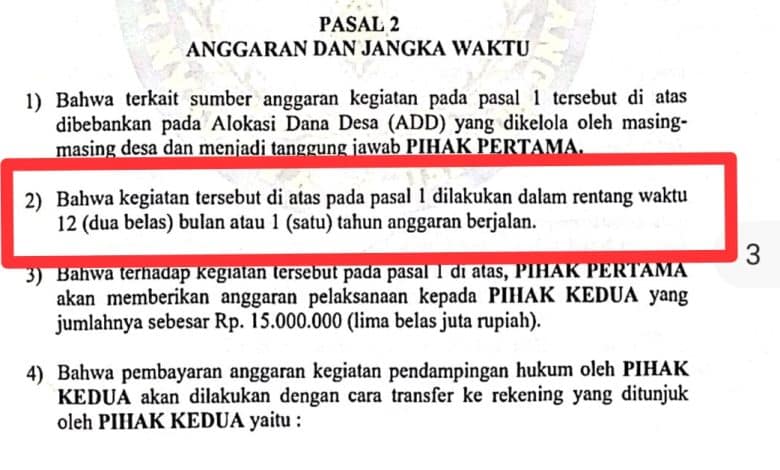 Yang mengejutkan lagi, beberapa dokumen tersebut berisi kontrak jasa hukum LBH TB dengan pihak desa yang melibatkan Dinas Pemberdayaan Masyarakat dan Desa (DPMD) Kabupaten Nunukan. Dalam kesepakatan yang tertuang melalui kontrak kerjsama, 232 Desa di Kabupaten Nunukan ‘wajib’ menyetor dana Rp15 juta per desa.