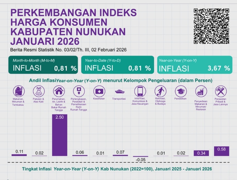 NUNUKAN – Baru menginjak awal tahun 2026, Kabupaten Nunukan sudah diwarnai kenaikan inflasi dari bulan sebelumnya. Dalam catatan inflasi month to month (m-to-m), Kabupaten Nunukan disebut mengalami kenaikan sebesar 0,81%. Kenaikan ini juga ditunjukkan pada inflasi year to date (y-to-d) yang juga mencapai angka sama.