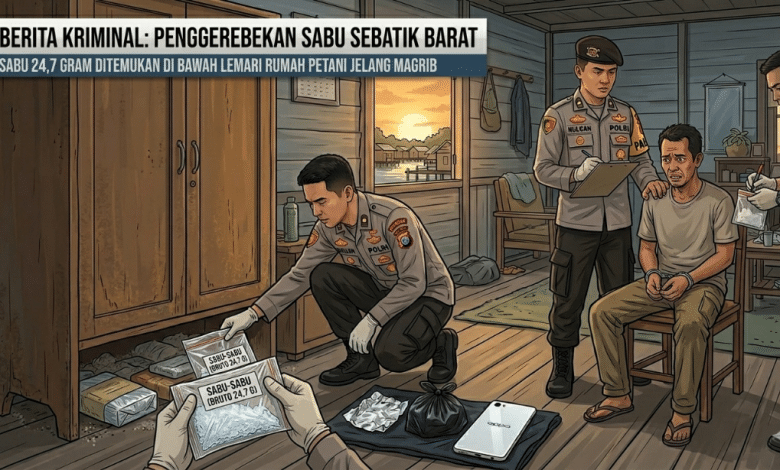 Hal ini terungkap saat Tim Opsnal Satresnarkoba Polres Nunukan menggerebek R di sebuah rumah di Jalan Bebatu RT 04, Desa Setabu, Kecamatan Sebatik Barat, sekira pukul 17.00 Wita, Jumat (20/2/2026) lalu. Di rumah sederhana itu, polisi menemukan satu paket sabu seberat bruto 24,7 gram yang disembunyikan di bawah lemari pakaian.