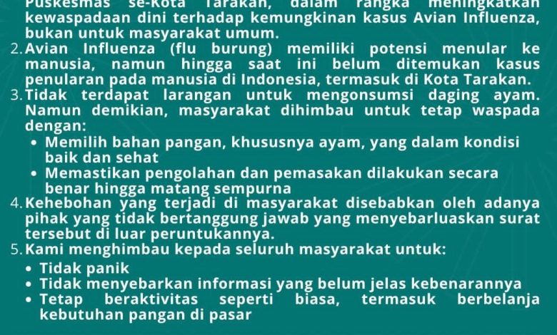 Kepala Dinkes Kota Tarakan, Devi Ika Indriarti menegaskan, masyarakat tidak perlu khawatir berlebihan terhadap isu yang berkembang. “Avian influenza memang memiliki potensi menular ke manusia, namun sampai saat ini belum ada kasus yang ditemukan di Tarakan,” ujarnya.